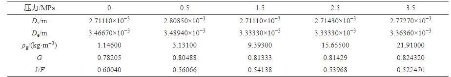 采用團(tuán)隊(duì)自開發(fā)的水與瓦斯之間的表面張力分析軟件對(duì)不同瓦斯壓力條件下的水滴形貌(圖3)進(jìn)行分析,即可獲得式(1)中的Ds及De。F為G修正后的形狀因子,F(xiàn)通過查表及插值法獲得,式(1)中的參數(shù)見表1,將表1中的參數(shù)帶入式(1)及式(2),即可獲得不同瓦斯壓力條件下水與瓦斯之間的表面張力(圖4)。
