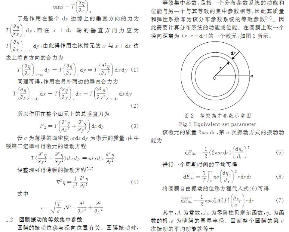 分析薄膜振動需進行受力分析。薄膜所受內(nèi)力僅為張力。設(shè)單位長度薄膜張力為T(N/m),單位面積質(zhì)量為ρ。取薄膜平衡位置在xy平面內(nèi)的微元體分析(圖1),當其受到垂直xy面的外力擾動后,會在張力T作用下產(chǎn)生橫向振動,恢復(fù)力主要為張力。