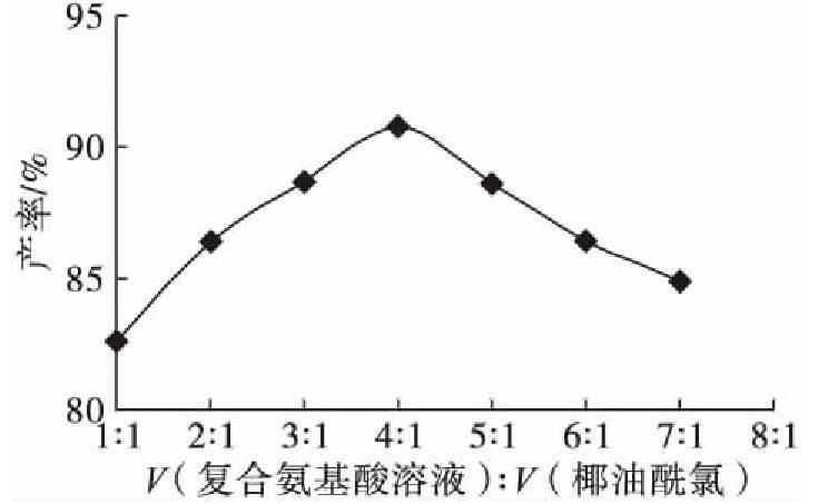 圖1復(fù)合氨基酸溶液與椰油酰氯體積比對(duì)產(chǎn)率的影響