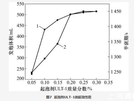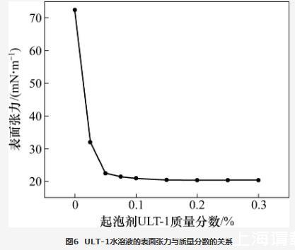 當(dāng)起泡條件相同時(shí),起泡劑水溶液的表面張力越低,發(fā)泡體積越高。配制一系列濃度梯度的起泡劑ULT-1水溶液,利用接觸角/表面張力測量儀采用懸滴法測量表面張力與起泡劑ULT-1質(zhì)量分?jǐn)?shù)的關(guān)系,結(jié)果如圖6所示。從圖6可知:當(dāng)起泡劑ULT-1質(zhì)量分?jǐn)?shù)小于0.05%時(shí),表面張力隨起泡劑ULT-1質(zhì)量分?jǐn)?shù)的提高快速降低;當(dāng)起泡劑ULT-1質(zhì)量分?jǐn)?shù)大于0.05%時(shí),表面張力降幅越來越小;當(dāng)起泡劑ULT-1質(zhì)量分?jǐn)?shù)提高至0.2%時(shí),表面張力降至20.40 mN/m,較蒸餾水降低了71.82%,繼續(xù)提高起泡劑ULT-1的質(zhì)量分?jǐn)?shù),表面張力不再降低。表明新型起泡劑ULT-1在較低濃度時(shí)即達(dá)到較低的表面張力,有利于提高發(fā)泡體積。