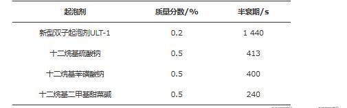 起泡性能主要是指起泡能力和泡沫穩(wěn)定性。發(fā)泡體積V0反映了起泡能力,析液半衰期t1/2反映了泡沫穩(wěn)定性。在室溫下,稱取一定質(zhì)量的起泡劑ULT-1于攪拌杯中,加入100 mL蒸餾水,置于攪拌器之上,以轉(zhuǎn)速11 000 r/min攪拌1 min。攪拌完畢后,立即取下攪拌杯,同時(shí)啟動(dòng)秒表,開始記錄消泡時(shí)間,將攪拌杯中的所有物質(zhì)全部倒入1 000 mL量筒中,讀取發(fā)泡體積和從泡沫中析出50 mL液體的時(shí)間,即為半衰期。通過改變起泡劑ULT-1的質(zhì)量測量起泡性能與起泡劑質(zhì)量分?jǐn)?shù)的關(guān)系,結(jié)果如圖7所示。從圖7可知:隨起泡劑ULT-1質(zhì)量分?jǐn)?shù)的提高,發(fā)泡體積增加幅度較大,半衰期緩慢增加。當(dāng)ULT-1質(zhì)量分?jǐn)?shù)升到0.2%時(shí),發(fā)泡體積達(dá)到501 mL,半衰期達(dá)到1 440 s,繼續(xù)提高質(zhì)量分?jǐn)?shù)發(fā)泡體積和半衰期基本不變,表明研制的新型起泡劑ULT-1低濃度時(shí)即具有較高的起泡性能,發(fā)泡體積高,泡沫半衰期長。同時(shí),對比評價(jià)了常用起泡劑的半衰期,結(jié)果如表1所示。從表1可知:質(zhì)量分?jǐn)?shù)為0.2%的起泡劑ULT-1與質(zhì)量分?jǐn)?shù)為0.5%的常規(guī)起泡劑相比,泡沫半衰期可提高3倍以上。