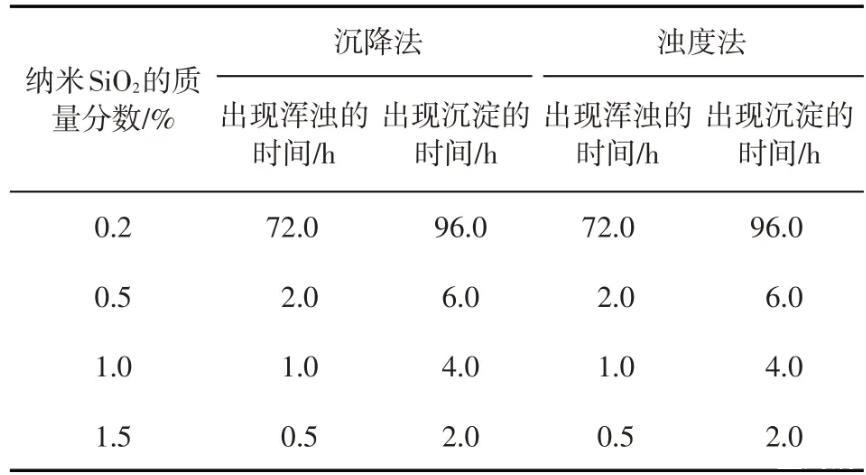 用模擬地層水配制的納米SiO2/SDS體系經歷了澄清透明-渾濁-沉降的3個階段,靜置初始,納米SiO2質量分數為0.5%的體系的濁度不隨時間的延長而變化,表明此時體系穩定;靜置1 h后,濁度明顯增加;靜置6 h后,體系的濁度又恢復到了初始值,由于實驗測試的是樣品上半部分的濁度,說明此時體系已經完全沉降。