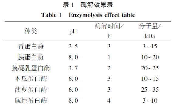 為實現膠原蛋白肽分子量可控均一,分別比較了胃蛋白酶、胰蛋白酶、胰凝乳蛋白酶、木瓜蛋白酶、菠蘿蛋白酶、堿性蛋白酶的酶解效果,在酶本身最適pH條件下,酶解至分子量不發生明顯變化,檢測其酶解后分子量分布(分子量計算依據圖1中的標準曲線),結果見表1。從表中結果可以看出不同的酶對膠原蛋白的酶解效果不盡相同,然而均未能達到控制其分子量在200~5 000 Da的預期效果。胰蛋白酶酶解速度最快,1 h酶解結束,而堿性蛋白酶是這幾種蛋白酶中酶解后分子量最小的。因此,將這2種最適pH為8.0的蛋白酶混合,經條件優化發現胰蛋白酶。堿性蛋白酶為2:5時,2種酶同時作用可以在1 h內將膠原蛋白酶解至200~5 000 Da(凝膠過濾色譜檢測結果見圖2)。堿性蛋白酶酶切位點為Ala、Leu、Val、Tyr、Phe、Try,胰蛋白酶酶切位點為Arg、Lys,這2種酶的酶切位點無重疊,從而在酶解過程中協同作用,實現了快速高效酶解。