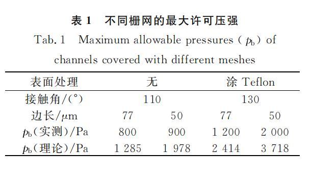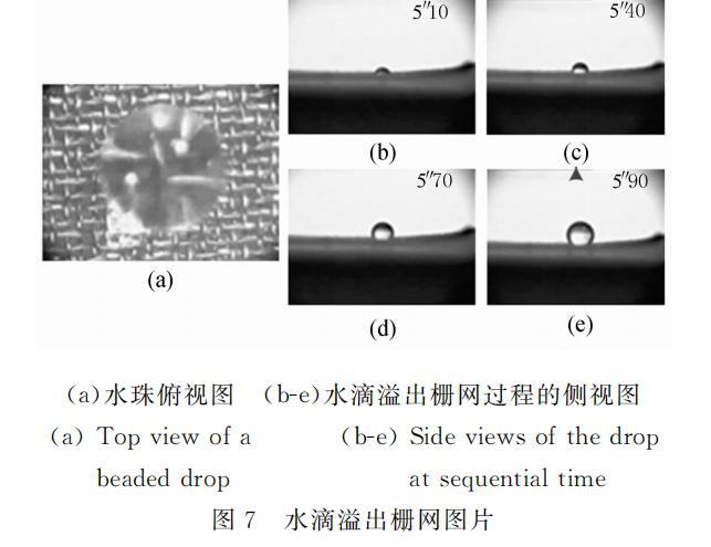 所用柵網(wǎng)為不銹鋼濾網(wǎng),有一定剛度,管道較窄,可以保證管道頂面平整。柵網(wǎng)孔為方形,使用的兩種柵網(wǎng)孔邊長分別為50mu m和77mu m。部分柵網(wǎng)涂覆Teflon(AF2400,DuPont),部分沒有做處理。圖5所示為未經(jīng)處理的柵網(wǎng)和柵網(wǎng)上的水滴。