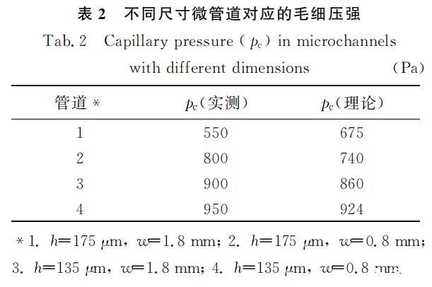 當(dāng)水流過干燥管道時(shí),表面張力產(chǎn)生的毛細(xì)壓強(qiáng)阻礙水的流動(dòng),此時(shí)的速度-壓強(qiáng)關(guān)系如圖8所示。在圖8的每條曲線上都有一個(gè)轉(zhuǎn)折點(diǎn),且在轉(zhuǎn)折點(diǎn)之后水的流速迅速增加,轉(zhuǎn)折處的壓強(qiáng)被作為毛細(xì)壓強(qiáng)p。對(duì)于這種現(xiàn)象可解釋為在壓強(qiáng)小于毛細(xì)壓強(qiáng)的時(shí)候,水只能在重力作用下極緩慢流動(dòng),由于速度極慢,沿程水頭損失可忽略不計(jì);當(dāng)壓強(qiáng)大于毛細(xì)壓強(qiáng)時(shí),黏性力和壓強(qiáng)差平衡,這時(shí)的流速增加較快。毛細(xì)壓強(qiáng)Pc的實(shí)測(cè)值和理論值如表2所示。水對(duì)于PDMS和壓敏膠的前進(jìn)角都是120°,對(duì)于Teflon涂膜的柵網(wǎng)接觸角是150°(芬蘭Kibron公司生產(chǎn)的Delta-8全自動(dòng)高通量表面張力儀)。實(shí)驗(yàn)結(jié)果與理論計(jì)算一致。