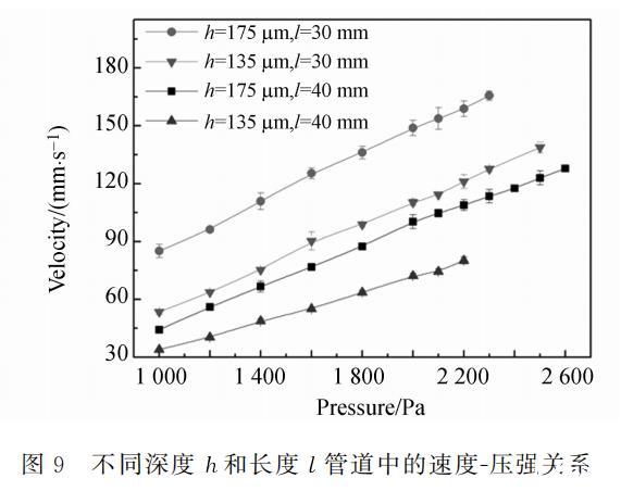 管道中充滿水時(shí)的速度-壓強(qiáng)關(guān)系如圖9所示。管道截面尺寸主要通過等效水力直徑影響摩擦阻力系數(shù)。由于管道深度遠(yuǎn)小于寬度,管道的等效水力直徑取決于管道深度,故這里固定管道寬度而對(duì)不同深度的管道進(jìn)行比較分析。由圖9可知,壓強(qiáng)一定,管道越深,長度越短,對(duì)應(yīng)的流速越大。圖中每條曲線的最大壓強(qiáng)就是測(cè)量中每個(gè)管道的最大許可壓強(qiáng),這些壓強(qiáng)值都大于表1中的最大許可壓強(qiáng)實(shí)測(cè)值。這一方面是由于柵網(wǎng)孔徑分布不均勻,另一方面是由于沿程水頭損失作用,管道中壓強(qiáng)分布沿流動(dòng)方向減小,導(dǎo)致最大壓強(qiáng)沒有出現(xiàn)在孔徑最大的地方,從而得到的壓強(qiáng)大于靜止?fàn)顟B(tài)下測(cè)得的最大許可壓強(qiáng)。