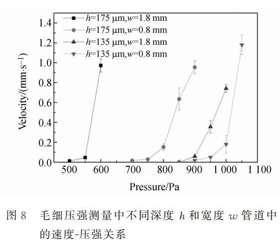 毛細(xì)壓強(qiáng)是微管道中水由靜止到開始流動(dòng)時(shí)對(duì)應(yīng)的轉(zhuǎn)折壓強(qiáng)。實(shí)驗(yàn)中采用CCD測(cè)量微管道中液體前端的前進(jìn)速度,并記錄相應(yīng)的水頭高度H。每次測(cè)量之前需把管道烘干。