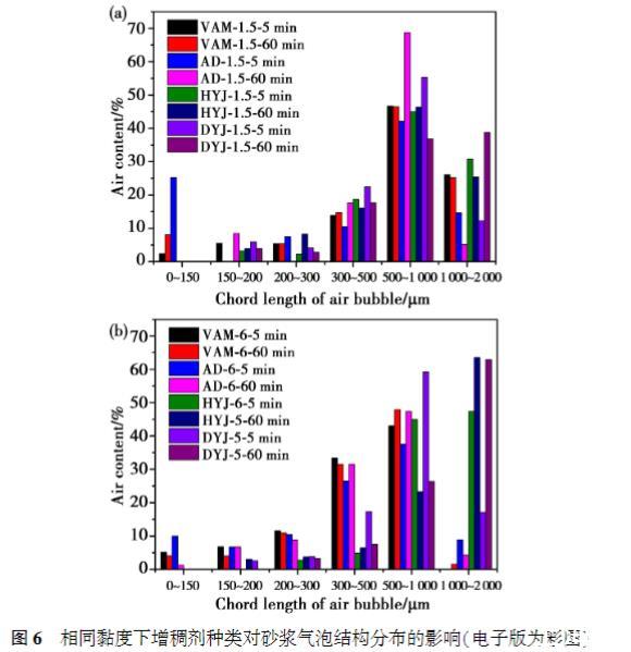 氣泡結構測試表明,砂漿黏度越高,氣泡結構集中于較大尺寸范圍內。隨著時間推移,高黏度體系下,500——1000μm的氣泡含量顯著下降,而1000——2000μm的氣泡含量則顯著提高;低黏度體系下,300——500μm的氣泡含量有所增大。
