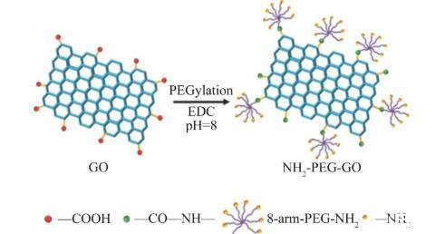 NH2-PEG-GO的制備方法:使用8-arm-PEG-NH2對GO表面進行修飾(圖1)。取80 mL上述細胞破碎機處理后的GO溶液,加入16 mL質量濃度為2 mg/mL EDC來活化GO表面羧基,然后將混合溶液在功率為570 W條件下超聲30 min(開1.5 s,關1 s),待分散均勻后,再用5%NaOH溶液來調節溶液酸堿性(pH=8),隨后將240 mg 8-arm-PEG-NH2加入,超聲反應30 min后,再常溫攪拌反應12 h,離心水洗后得到氨基修飾的GO,于室溫真空冷凍干燥2 d后,得到最終產物,將產物研磨備用。