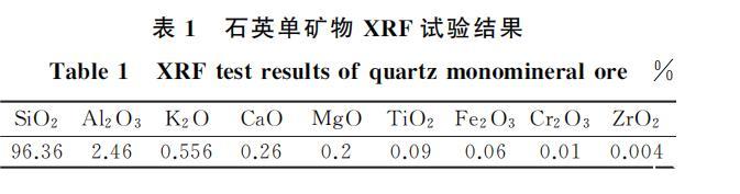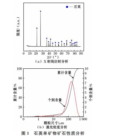 本試驗(yàn)所用的單礦物石英取自某礦廠,將制備后的石英單礦物樣品進(jìn)行X射線衍射(XRD)分析、X射線熒光光譜(XRF)分析和激光粒度分析,XRD的分析結(jié)果如圖1(a)所示,XRF的分析結(jié)果見(jiàn)表1,粒度分析如圖1(b)所示。從圖1(a)可以看出,石英單礦物SiO?峰強(qiáng)度以及密度最高,說(shuō)明SiO?占主導(dǎo)地位。從圖1(b)可以看出,樣品的中值粒徑D??達(dá)到了133.5μm,D??則達(dá)到了264.3μm.綜合上述礦物的純度以及粒度,石英可滿足后續(xù)單礦物試驗(yàn)以及機(jī)理分析的要求。