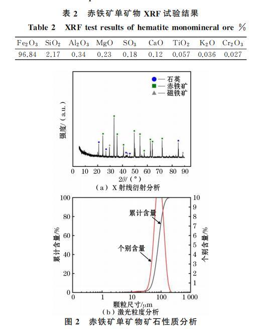 赤鐵礦單礦物則取自某鐵礦廠,將制備后的赤鐵礦樣品進(jìn)行X射線衍射(XRD)分析、X射線熒光光譜(XRF)分析和激光粒度分析,XRD的分析結(jié)果如圖2(a)所示,XRF的分析結(jié)果見(jiàn)表2,粒度分析如圖2(b)所示。從圖2(a)和表2可以看出,F(xiàn)e?O?峰強(qiáng)度最高,含量達(dá)到了96.84%,另外含有少量的氧化物SiO?、Al?O?等。從圖2(b)可以看出,樣品的中值粒徑D??達(dá)到了79.89μm,D??則達(dá)到了123.2μm.綜合上述純度以及粒度,赤鐵礦可滿足后續(xù)單礦物試驗(yàn)的要求。