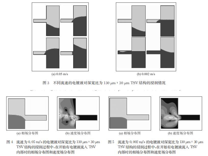 TSV深寬比設(shè)置為130μm:30μm,電鍍液流人速度為0.05 m/s和0.002 m/s的浸潤仿真結(jié)果分別如圖3所示,前者在TSV底部形成氣泡,后者可以完全浸潤。模擬結(jié)果表明降低電鍍液流入速度有利于浸潤。通過仿真中兩種情況下浸潤過程中的流速場對比,可以看出在電鍍液流入的過程中,電鍍液流人速度較大時,如圖4(b)所示,電鍍液表面距離TSV較遠(yuǎn)的部分有著相對更大的流速,即電鍍液流過TSV上方的速度大于電鍍液向TSV內(nèi)部流入的速度,導(dǎo)致在電鍍液流過TSV上方時,其流入TSV內(nèi)部的分流量還沒有充滿TSV內(nèi)部排出其中氣體之前,電鍍液就已經(jīng)流過了TSV上方,并將TSV口部封死,導(dǎo)致內(nèi)部殘留氣體無法排出,形成不完全浸潤;而當(dāng)電鍍液流入速度較小時,如圖5(b)所示,電鍍液表面在TSV口部附近具有相對更大的流速,即電鍍液向TSV內(nèi)部流入的速度大于其流過TSV上方的速度,使得電鍍液流過TSV上方時,有足夠的分流量流入TSV內(nèi)部,將其中氣體排出并將TSV填滿,實現(xiàn)完全的浸潤。