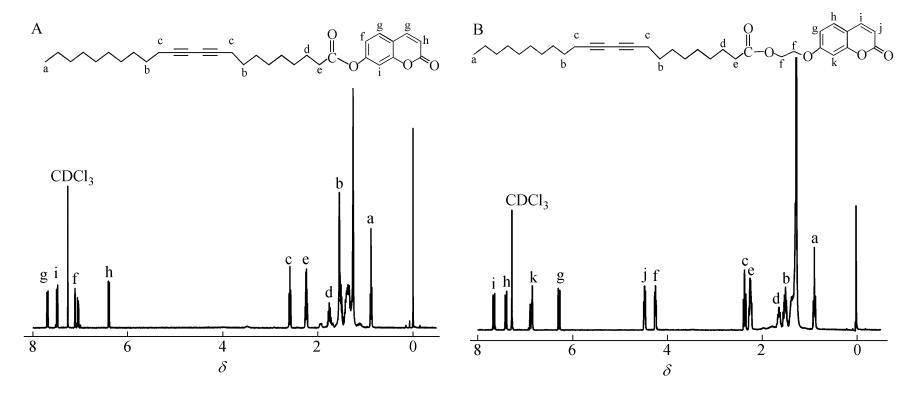 2類香豆素取代二乙炔單體參照文獻(xiàn)所述方法合成,分子結(jié)構(gòu)及產(chǎn)物核磁譜圖如圖1所示。將2種產(chǎn)物分別溶于氯仿,配成1mg/mL的溶液。亞相為超純水(18.2MΩ·cm)。所有的π-A曲線和LB膜拉制實(shí)驗(yàn)均為20℃條件下在KSV Mini-trough LB膜儀上進(jìn)行。溶劑充分揮發(fā)后,膜障以5 mm/min的速率對其壓縮,在20℃和恒定膜壓35 mN/m下以2mm/min速率沉積Y-型LB膜。基片為石英片。薄膜的聚合是在16W的紫外燈(波長254nm)輻照下完成的,薄膜表面距離燈管下緣10cm,輻照時(shí)間5min。