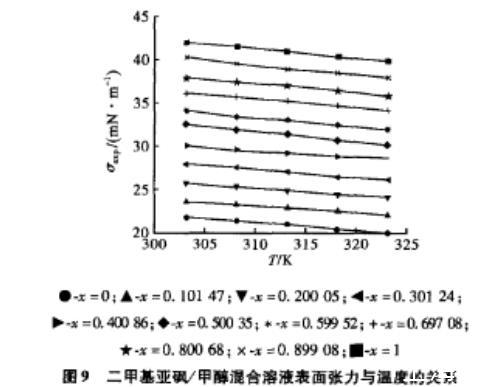 圖9 二甲基亞砜/甲醇混合溶液表面張力與溫度的關系