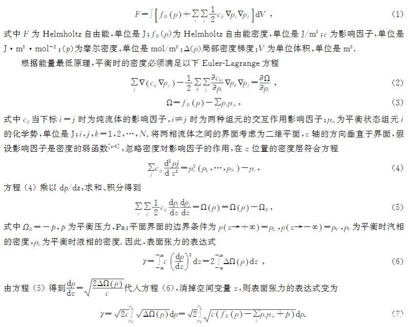 vanderWaals首先提出了密度梯度理論,并將該理論用于氣液界面,通過對(duì)氣液界面的研究得出結(jié)論,界面處的密度變化是連續(xù)的,后來該理論被Cahn和Hilliard完善。該理論中,界面的Helmholtz自由能密度為兩部分的加和:均相部分和非均相部分。Helmholtz自由能密度Taylor級(jí)數(shù)的二階展開式為