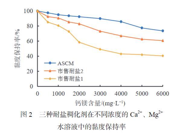 圖2三種耐鹽稠化劑在不同濃度的Ca2+、Mg2+水溶液中的黏度保持率