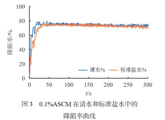 使用CDMZ-IV型管路摩阻儀模擬14 m3/min的施工排量分別測(cè)試0.1%ASCM在清水、標(biāo)準(zhǔn)鹽水中的降阻性能,。