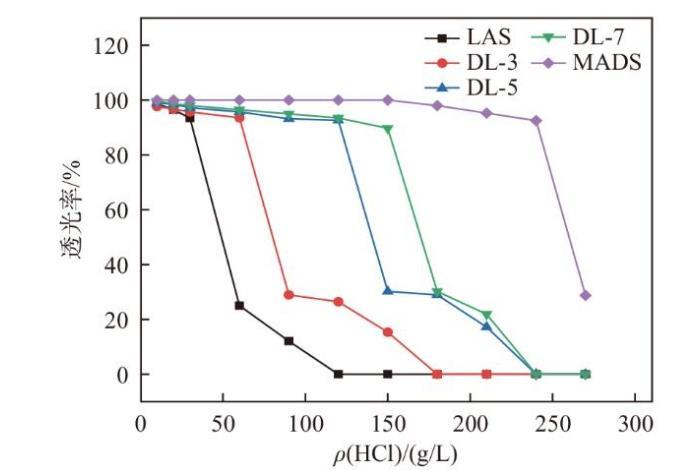 在許多工業過程中,表面活性劑會接觸到酸性環境,例如石油開采中的酸化處理、金屬表面處理、酸性清洗劑等[8-10]。研究表面活性劑的耐酸性可以確保這些產品在酸性條件下仍能保持穩定性和功能性,從而避免在苛刻條件下失效或分解。磺酸基團為C-S鍵,與硫酸鹽類表面活性劑(如AES)相比,在酸性條件下較穩定,不易分解。圖4給出了LAS、DL-n、MADS的耐酸性透光率圖,可以看出,隨著混合磺酸鹽中烷基二苯醚含量的增加,耐酸性逐漸增加。LAS耐酸性最差,MADS的耐酸性最好,在270 g/L時渾濁。混合磺酸鹽在結構上并沒有發生破壞,發生渾濁是由于聚集體形態發生了變化,從而體現出溶液渾濁的現象。