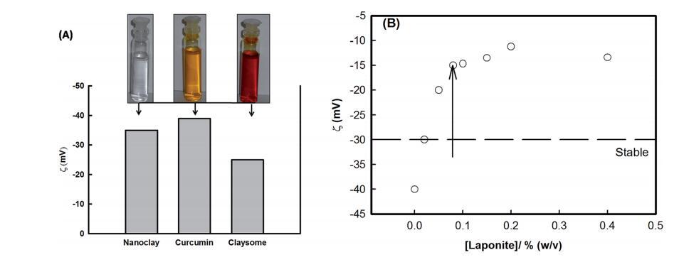圖3(A)描繪姜黃素、納米粘土和粘土小體的zeta電位的直方圖。插圖顯示了姜黃素在乙醇中的分散,納米粘土在水中的分散,以及由納米粘土在無水乙醇環境中穩定的姜黃素納米顆粒組裝而成的粘粒結構(顏色的變化(插圖中所示)清楚地表明了姜黃素和納米粘土之間的相互作用)。(B) 粘土小體組裝的zeta電位隨納米粘土濃度的變化。這清楚地表明了在較低濃度的納米粘土中組裝的穩定性。箭頭表示粘土成分。