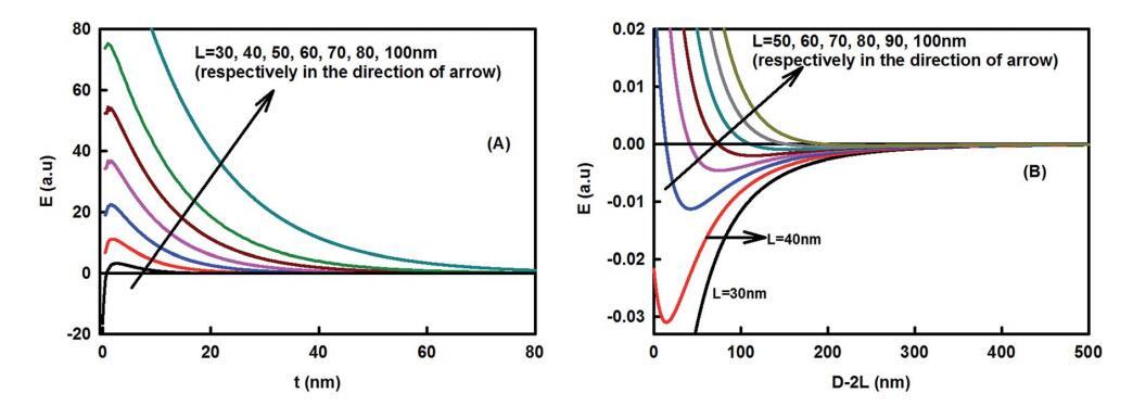圖5納米粘土簇的長度對粘土小體組裝的影響。(A) 作為界面區域厚度函數的能量變化(s?60 nm;T?298 K,f?0.5;姜黃素納米顆粒半徑R?50 nm,疏水衰減長度x0?1 nm,界面張力?40 mN m-1)。(B) 粘粒–粘粒相互作用作為粒間分離D的函數,使用方程(5)計算。當存在大的納米粘土團簇時,能量最小值的深度減小,當L>80nm時,能量變得完全排斥。