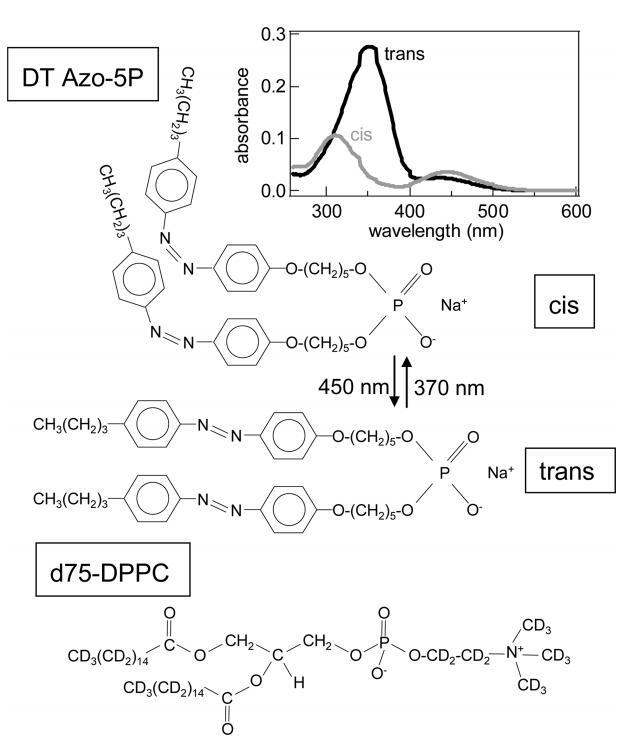 圖1。 順式和反式構(gòu)型的光開(kāi)關(guān)脂質(zhì)DT Azo-5P和d75 DPPC的分子結(jié)構(gòu)。 右上角的插圖顯示了CHCl3中DT Azo-5P的紫外/可見(jiàn)光譜( ~ 在370nm(順式狀態(tài))和450nm(反式狀態(tài))下輻照約10s后,使用7μM,1cm的反應(yīng)杯。