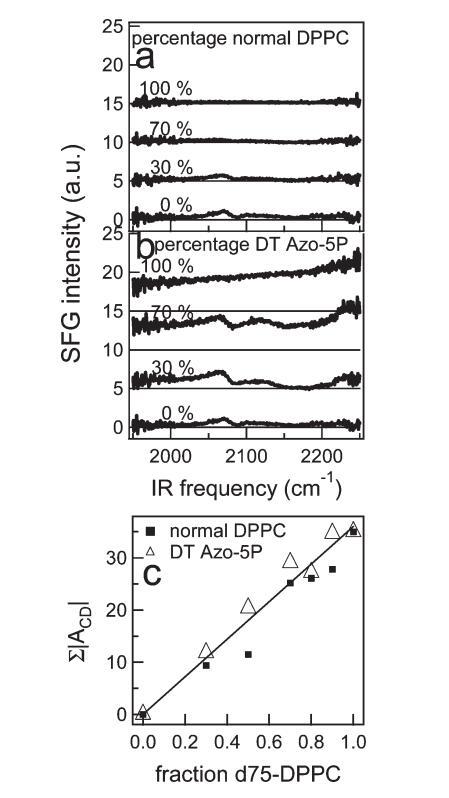 圖9。 (a) 正常DPPC和d75 DPPC不同混合物的CD區(qū)VSFG光譜。 圖中給出了混合物中正常DPPC的百分比。 為清晰起見(jiàn),光譜偏移,細(xì)線表示零。 (b) 與a部分類似,但適用于DT Azo-5P與d75 DPPC的混合物。 (c) 通過(guò)擬合文中描述的VSFG光譜獲得的CD振動(dòng)振幅之和,作為含正常DPPC或DT Azo-5P的二元混合物中分?jǐn)?shù)d75 DPPC的函數(shù)。 在本實(shí)驗(yàn)中,為了獲得混合物的高質(zhì)量數(shù)據(jù),IR通量很高,導(dǎo)致通過(guò)VSFG光譜中相對(duì)較高的CH2和CD2振幅觀察到的脂質(zhì)尾部出現(xiàn)小的無(wú)序。