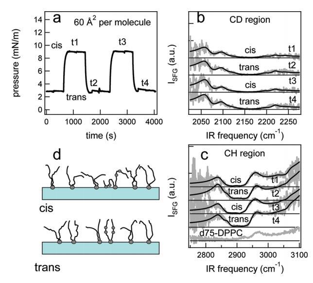圖6。在脂質(zhì)/H2O界面處,DT Azo-5P/d75 DPPC的1:5混合物的結(jié)果,每個(gè)分子的面積為60?2。(a) 表面壓力與時(shí)間的關(guān)系。用370和450 nm光照射~100秒分別產(chǎn)生順式(高壓)和反式(低壓)狀態(tài)。壓力的微小劇烈波動(dòng)是由于樣品高度的變化,以校正水的蒸發(fā)。(b) 相應(yīng)的VSFG光譜(灰色)以及CD區(qū)域的擬合。為了清晰起見(jiàn),光譜已被抵消。(c) VSFG光譜(灰色)以及用于引導(dǎo)眼睛進(jìn)入CH區(qū)域的擬合。底部曲線顯示了在P時(shí)純d75 DPPC的光譜~ 40百萬(wàn)/米。(d) 脂質(zhì)尾部方向的示意圖。光開(kāi)關(guān)脂質(zhì)的偶氮苯部分用灰色圓圈表示。
