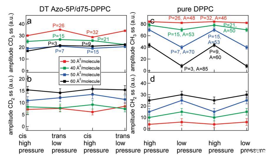圖8.在d75 DPPC和DT Azo-5P(左)的5:1比率的實(shí)驗(yàn)中,d75 DPPC和純正常DPPC(右)的擬合結(jié)果。(a)CD3對(duì)稱拉伸振動(dòng)模式的振幅作為不同密度的光開(kāi)關(guān)脂質(zhì)狀態(tài)的函數(shù);(b)CD2對(duì)稱拉伸振動(dòng)模式的振幅作為不同密度的光開(kāi)關(guān)脂質(zhì)狀態(tài)的函數(shù);右圖顯示了純DPPC的類似結(jié)果,壓力與左圖相似,其中(c)CH3對(duì)稱拉伸振動(dòng)模式的振幅和(d)CH2對(duì)稱拉伸模式的振幅。共振的寬度和頻率在擬合中是固定的。