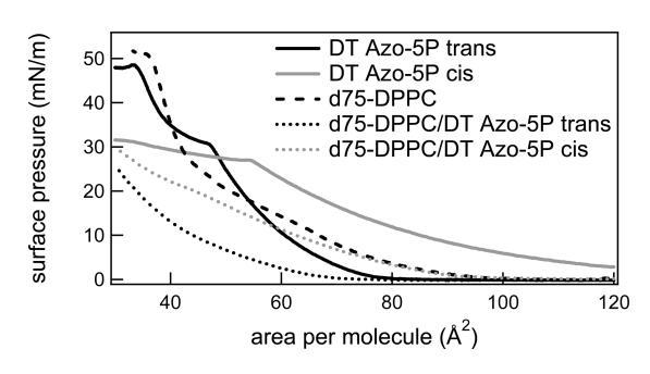 圖2。反式和順式狀態(tài)下的光開(kāi)關(guān)脂質(zhì)DT Azo-5P(實(shí)線)、d75-DPPC(虛線)以及光開(kāi)關(guān)兩種狀態(tài)下的1:5摩爾比的光開(kāi)關(guān)脂質(zhì)和d75-DPPC(虛線)的表面壓力與面積等溫線。