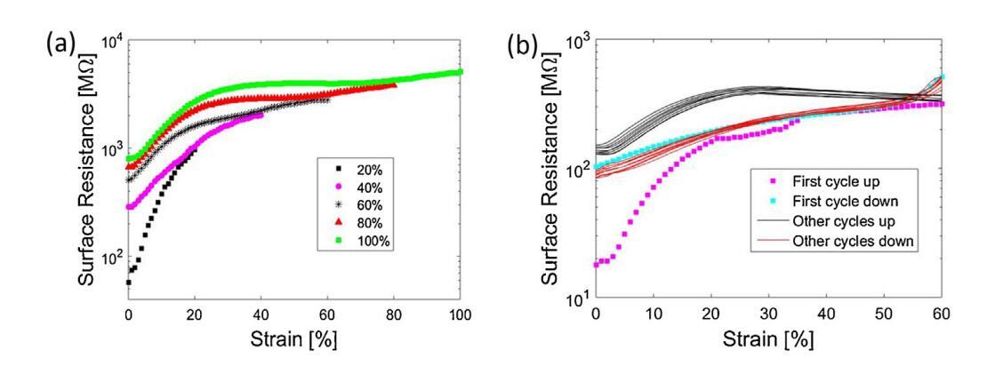 圖6a顯示了在20%和100%之間增加最大應(yīng)變的不同連續(xù)循環(huán)中,樣品表面電阻的變化。僅顯示拉伸循環(huán)。在前20%應(yīng)變期間,電阻增加約一個(gè)數(shù)量級,表明MWCNT網(wǎng)絡(luò)內(nèi)的互連比降低。當(dāng)恢復(fù)到0%應(yīng)變時(shí),電阻沒有達(dá)到其初始值,而是增加了6倍。這突出了由于機(jī)械變形導(dǎo)致的電性能的不可逆變化。隨著最大施加應(yīng)變的增加,每個(gè)循環(huán)都會(huì)發(fā)生這種情況。然而,可以觀察到,在恢復(fù)到0%應(yīng)變后,表面電阻的增加在60%應(yīng)變以上不太明顯。值得注意的是,單層電極在100%單軸應(yīng)變下仍保持導(dǎo)電。