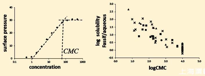 表面張力由一種成熟的體外測(cè)定法測(cè)定,該測(cè)定法通過測(cè)量化合物的臨界膠束濃度和兩親性來評(píng)估化合物的表面活性劑性質(zhì)。 兩親性是用于量化化合物與生物膜親和力的一個(gè)關(guān)鍵屬性,在制藥工業(yè)中廣泛用于預(yù)測(cè)藥物誘導(dǎo)的磷脂病,11,12 ? 腦屏障滲透,13和藥物淋巴吸收。 14在這項(xiàng)工作中,我們同樣評(píng)估了化合物對(duì)生物相關(guān)介質(zhì)中所含膠束的親和力是否可以用化合物固有的表面活性劑性質(zhì)來解釋。 因此,我們對(duì)不同化合物的表面活性劑性質(zhì)進(jìn)行了表征,以將此類表面活性性質(zhì)與FaSSIF中觀察到的與水介質(zhì)溶解度相比的溶解度增強(qiáng)程度相關(guān)聯(lián)。 共分析了51個(gè)分子,包括上市藥物和羅氏專利化合物,具有廣泛的溶解性、親脂性和電離狀態(tài)。