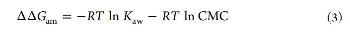式中,π對應(yīng)于表面壓力,C對應(yīng)于化合物濃度。(ii)CMC:對應(yīng)于最大表面壓力下平臺截距和曲線外推斜率的臨界膠束濃度(?π/?lnc)處于拐點(圖3)。(iii)ΔΔGam:式3中的兩親性