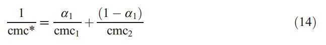 圖8顯示了Mega-10和DPS二元混合物在純水和不同α-CD濃度(2–8 mM)下的混合cmc值。從圖8可以清楚地看出,α-CD中的混合cmc值高于純水中的值,并且這些值隨著α-CD濃度的增加而增加。為了評估混合膠束的行為,即混合膠束是否表現(xiàn)出理想或非理想行為,我們使用了偽相分離模型[31]。簡言之,根據(jù)該模型,膠束被認(rèn)為是宏觀相,與含有相應(yīng)單體的溶液相平衡。對于表面活性劑的理想二元混合物,cmc由等式[31]關(guān)聯(lián)