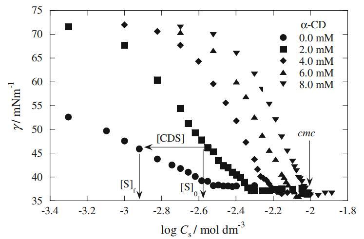 圖1顯示了2 mM Mega-10和DPS溶液的界面張力(γ)隨不同α-CD濃度的變化。兩種表面活性劑溶液的界面張力值均隨α-CD濃度的增加而增加。這種行為表明α-CD與Mega-10和DPS形成包合物,這些包合物沒有任何表面活性。在沒有α-CD的情況下,不同濃度的α-CD的界面張力對應(yīng)于γ值,這證實(shí)了CD本身不具有表面活性(數(shù)據(jù)未顯示)。圖2顯示了Mega-10和DPS(αDPS=0.8)混合體系在不同α-CD濃度下的總表面活性劑濃度的γvs.log曲線。每條曲線顯示與cmc對應(yīng)的斷點(diǎn)。在圖2中,由于α-CD中加入了表面活性劑單體,通過降低本體中的游離表面活性劑單體濃度延遲了膠束形成過程,因此每條曲線也移向更高的表面活性劑濃度。此外,cmc以上表面活性劑的γ值與α-CD濃度無關(guān)(圖2)。這表明表面活性劑與α-CD形成的包合物不參與界面吸附。在α-DPS=0.0、0.2、0.4、0.6和1.0時,在不存在和存在2-8mmα-CD濃度的情況下,獲得了類似的曲線圖(數(shù)據(jù)未顯示)。Mega-10和DPS的α-CD濃度依賴性cmc值如圖3所示。圖3清楚地顯示了cmc和α-CD濃度之間的線性關(guān)系。這一行為是表面活性劑和α-CDs之間形成包合物的另一個跡象,導(dǎo)致表觀cmc值增加。純Mega-10(5.75 mM)和DPS(2.57 mM)測定的cmc值與報告的文獻(xiàn)值一致[24–26]。