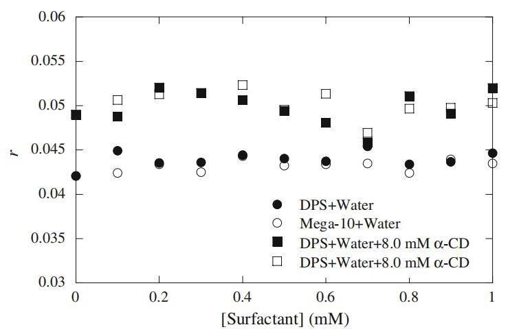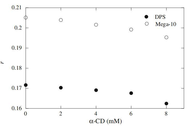在這項工作中,我們研究了RB與表面活性劑-α-CD-水三元體系的詳細(xì)相互作用,以便系統(tǒng)地研究RB的極化行為。在進(jìn)入膠束介質(zhì)之前,我們排除了RB與水溶液和水溶液α-CD介質(zhì)中前冰層表面活性劑濃度(1 mM)的結(jié)合行為。圖10顯示了在冰層前表面活性劑濃度下,Mega-10和DPS的RB各向異性行為。在水中和存在α-CD(8mm)的情況下,我們未觀察到表面活性劑RB的右旋值有任何顯著變化。從圖10獲得的結(jié)果意味著探針RB不與表面活性劑單體、環(huán)糊精和α-CD表面活性劑包合物結(jié)合。在這些初始測量之后,我們將我們的實(shí)驗方法擴(kuò)展到膠束介質(zhì),以觀察RB的各向異性行為。圖11顯示了純表面活性劑以及Mega-10和DPS二元混合物(15mm)的α-CD(2-8mm)依賴性各向異性行為。從圖11可以得出一些有趣的結(jié)論。首先,圖11清楚地表明,在水介質(zhì)中,純Mega-10的膠束比DPS的膠束具有更高的微粘度。這種行為可以用表面活性劑分子在膠束中的堆積排列來解釋,表明Mega-10膠束中的堆積比DPS膠束中的更緊密。對于二元混合物,r值隨著DPS(αDPS)摩爾分?jǐn)?shù)的增加而減小,這表明DPS被誘導(dǎo)到混合膠束中產(chǎn)生的剛性結(jié)構(gòu)較低(參見圖11中最左邊的圖例)。其次,在DPS的每摩爾分?jǐn)?shù)下,r值隨α-CD濃度的增加而線性減小。盡管隨著α-CD濃度的增加,在αDPS=0.0時,r值的下降更為瞬時。我們注意到,r值的瞬時降低是由于膠束濃度的降低。為了證實(shí)這一結(jié)果,我們在20 mM濃度下對αDPS=0.0(即Mega-10)進(jìn)行了各向異性測量,圖12中繪制了Mega-10的觀測r值,并與15 mM濃度下的αDPS=1.0(即DPS)進(jìn)行了比較。正如我們所見,隨著α-CD濃度的增加,Mega-10(20 mM)的r值沒有瞬時下降,這表明圖11中r值的急劇下降是由于膠束濃度的降低。DelaCruz等人研究了RB衍生物與陰離子、陽離子和非離子表面活性劑的相互作用,并得出結(jié)論,RB衍生物的酯鏈的電荷和長度控制著與不同膠束系統(tǒng)的相互作用[35]。