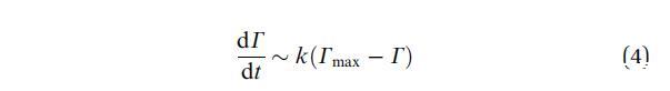 當(dāng)系統(tǒng)接近飽和時(shí),G(t)的下降速度必須隨著表面變得擁擠而減慢。吸附質(zhì)濃度剛好低于表面,然后與吸附物種失去平衡,動(dòng)力學(xué)受到吸附屏障的限制。一級(jí)動(dòng)力學(xué)過(guò)程會(huì)導(dǎo)致: