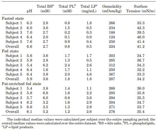 當考慮五個不同的受試者時,總膽汁鹽濃度隨時間的變化在所有三種營養(yǎng)狀態(tài)下都呈現(xiàn)波動模式(圖3)。無法定義可應用于每個單獨圖表的清晰的濃度-時間曲線。文獻中也報道了喂食條件下膽汁鹽濃度的高度變化。可以找到高達37 mM27和低至0.5 mM33的值;然而,文獻中觀察到的典型膽鹽濃度約為10mm,在進食后30–60分鐘檢測到。11,12,19,33在本研究中,攝入Sure Plus1后30分鐘,膽汁鹽濃度中值為8.3 mM;在高脂肪喂養(yǎng)狀態(tài)下,30分鐘后獲得的中值為11.9 mM。這些中值與文獻中觀察到的典型值一致。相比之下,五名登記受試者的單獨匯集腸道樣本顯示,在兩種喂養(yǎng)狀態(tài)下,總膽汁鹽濃度均低于5.3 mM。同樣在禁食狀態(tài)下,當不存在膽囊收縮刺激時,可以看到高度可變和時間依賴性的膽鹽濃度:濃度范圍為0.3至9.6 mM(圖3)。Lindahl等人的一項研究也描述了類似的高變異性。34作者報告了24名志愿者的禁食狀態(tài)膽鹽濃度,范圍在0.1至13.3 mM之間,總收集時間為150分鐘。Brouwers等人2和Perez de la Cruz Moreno等人24也報告了禁食狀態(tài)下的膽鹽濃度單個志愿者的小腸,分別為1.0至5.3 mM和0.5至5.5 mM。使用當前數(shù)據(jù)集計算的個體膽汁鹽濃度中位數(shù)顯示出較小的受試者間變異性,最小值為2.0 mM,最大值為3.0 mM;總體中值為2.6 mM(表2)。這些中值與禁食狀態(tài)下報告的膽鹽水平相當吻合:之前的文章描述了禁食狀態(tài)下總膽鹽濃度在2.0和5.9mm之間。11–13,19與當前設置中采用的120分鐘的總取樣周期相反,在后述報告中使用單時間點測定來評估空腹水平。11–13,19