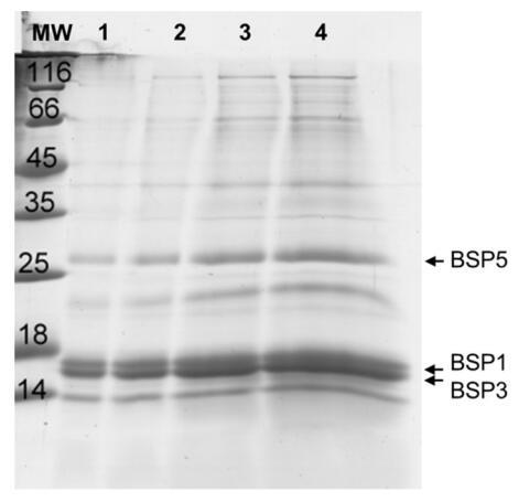 圖1。從牛射精中分離并以不同濃度沉積的精漿SDS-PAGE凝膠:lane 1:1g;車道2:2g;車道3:5g和車道4:10g。
