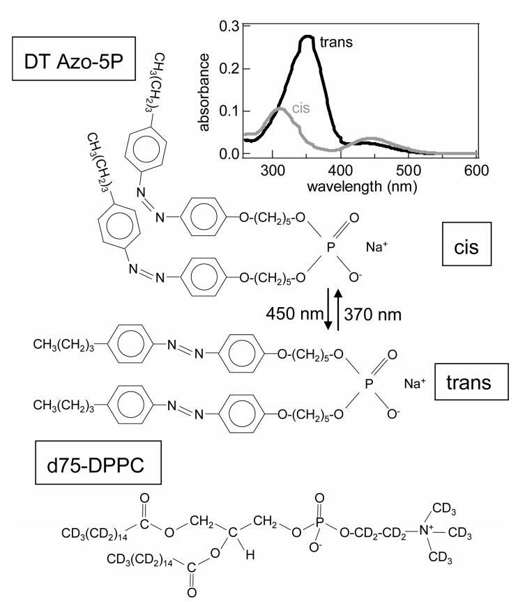 圖1:。順式和反式構(gòu)型的光開關(guān)脂質(zhì)DT Azo-5P和d75 DPPC的分子結(jié)構(gòu)。右上角的插圖顯示了CHCl3中DT Azo-5P的紫外/可見光譜(~在370 nm(順式)和450 nm(反式)下輻照約10 s后,使用7μM,1 cm反應(yīng)杯)。