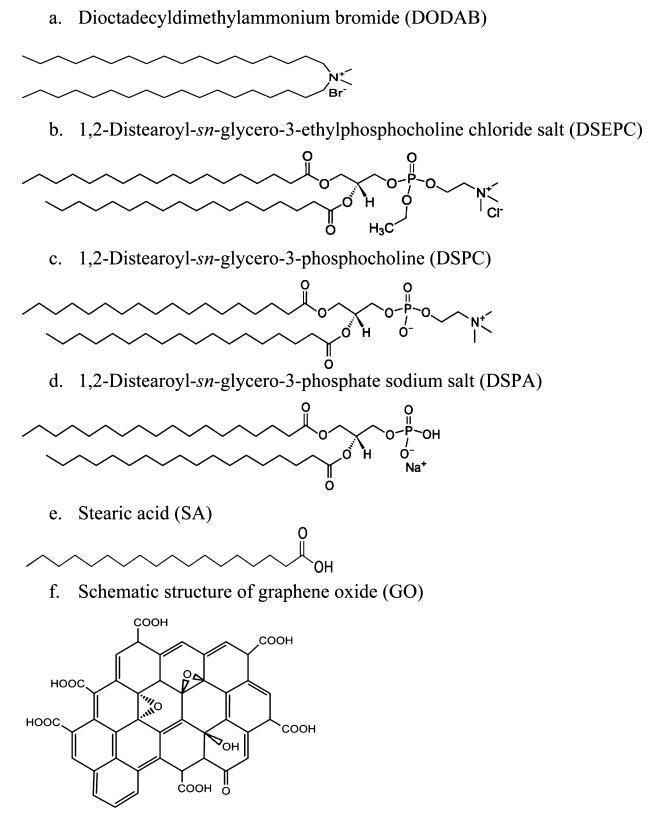 正電荷脂質(zhì)二十八烷基二甲基溴化銨(DODAB)和1,2-二硬脂酰-sn-甘油-3-乙基磷酸膽堿氯化鹽(DSEPC)、中性電荷兩性脂質(zhì)1,2-二硬脂酰-sn-甘油-3-磷酸膽堿(DSPC)和負電荷脂質(zhì)1,2-二硬脂酰-sn-甘油-3-磷酸鈉鹽(DSPA)購自Avanti Polar Lipides(Alabaster,AL)。硬脂酸(SA)購自SigmaAldrich(密蘇里州圣路易斯)。由于頭部基團中存在陰離子磷酸鹽和陽離子季銨中心,DSPC帶中性電荷,如方案1c所示。由于羧基脫質(zhì)子化,SA被認為是帶負電的分子。所有這些脂質(zhì)在非極性尾部都有18個碳鏈烷基。光譜級氯仿和甲醇來自MP Biomedicals(Solon,OH)。單層GO購自ACS Material LLC(馬薩諸塞州梅德福德)。所有這些化學品均未經(jīng)任何進一步凈化?;瘜W結(jié)構(gòu)如圖1所示。實驗中使用的去離子水來自Modulab 2020水凈化系統(tǒng)(德克薩斯州圣安東尼奧)。去離子水的電阻率、表面張力和pH值在20.0±0.5°C時分別為18 MΩ·cm、72.6 mN/M和5.6。所有實驗均在恒溫20.0±0.5°C、濕度50±1%的潔凈室(1000級)中進行。