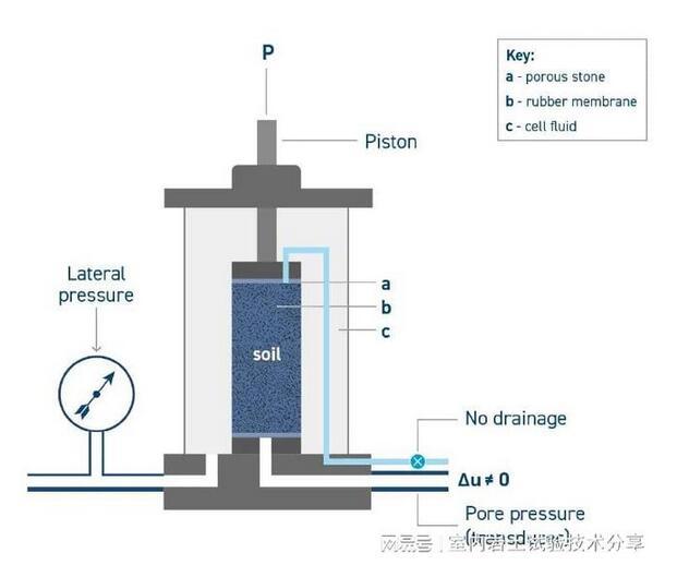 這里以有效應力來衡量剪切強度。試樣飽和并允許在所需的約束壓力下進行固結(土壤固結是改變其結構和含水量的過程)。一旦固結,試樣就被施加了一定的荷載,在此期間不允許排水,以便測量孔隙壓力。