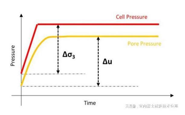 飽和后,試樣通常被固結到代表其原位條件的應力狀態。固結通常是各向同性的應力-垂直和水平施加給樣品的應力相同(σ3=σ1)。然而,固結也可以是各向異性的,其中σ3≠σ1。在這種情況下,測試通??s寫為CIU(各向同性固結不排水)或CAU(各向異性固結不排水)。試樣固結通常通過增加圍壓進行,同時保持恒定的反壓(通常等于最終飽和度B檢測期間達到的孔隙壓力)。