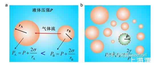 氣泡液體是大小不同的球狀氣泡分散到液體中的液氣體系。在氣泡液體中,大小不同氣泡是一個(gè)不穩(wěn)定的體系,其內(nèi)部不等的壓強(qiáng)會(huì)使整個(gè)體系變化,總體趨勢(shì)是氣泡半徑出現(xiàn)粗化現(xiàn)象,這種粗化跟晶體生長(zhǎng)中的Ostwald熟化的現(xiàn)象是一致的(Ref 1)。根據(jù)附加壓力公式,可知較小的氣泡其內(nèi)部具有較大的壓強(qiáng),因此與旁邊較大的氣泡間就會(huì)存在壓強(qiáng)差(圖1a),氣泡間液體兩側(cè)的壓強(qiáng)差會(huì)使氣體從壓強(qiáng)較大的地方向較小的地方擴(kuò)散,從而出現(xiàn)大的氣泡增大,小的氣泡減小直至消失的情形,這就是氣泡Ostwald熟化的機(jī)理(Ref 2)。從能量的觀點(diǎn)來(lái)說(shuō),Ostwald熟化的結(jié)果降低了體系的表面能,從而使整個(gè)體系更加穩(wěn)定。
