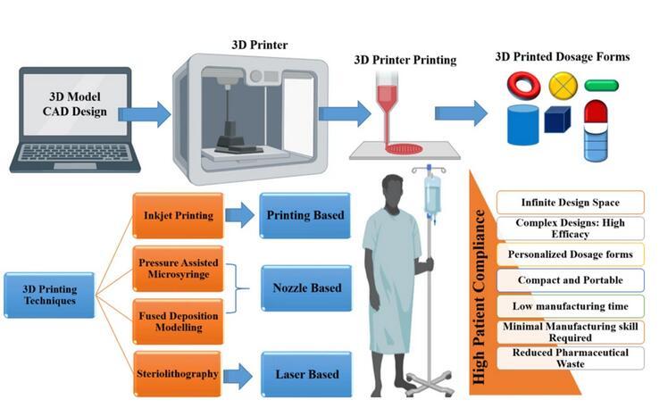 3D打印技術(shù)中不需要造粒、壓片以及包衣等環(huán)節(jié),并且可以靈活控制藥物的劑量以及釋放,所以該技術(shù)逐漸發(fā)展起來。3D打印技術(shù)主要有選擇性激光燒結(jié)(SLS)、光固化成型(SLA)、熔融沉積成型(FDM)、半固體擠出成型(SSE)以及噴墨成型打?。↖JP)等方式。3D打印藥物目前的代表藥物,為FDA批準(zhǔn)的Spritam。