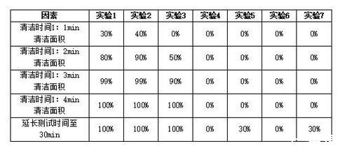 通過實驗1我們發(fā)現:在浸泡清洗中各組分均能達到較好的清潔效果,但各組分最終清潔時間有差異,具體數據如下表