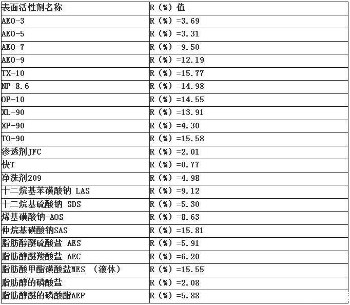 R值越大,表明凈洗能力越強,該測試標準可用來表征表面活性劑對一般污垢的去除,不適用于反映油脂和蠟質的去除能力。