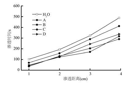 將抑塵劑A、B、C、D分別配制成0.2 wt.%的水溶液,在煤粉NR表面進行正向滲透試驗,研究不同抑塵劑滲透煤塵距離1 cm、2 cm、3 cm、4 cm的潤濕能力。
