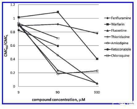 濃度依賴性。體內(nèi)研究中PLD的程度是劑量依賴性的。24,33在體外試驗中,濃度控制可用于估計劑量依賴性。一組七種報告的PLD誘導劑分別以三種不同的濃度進行了測試:910、91和9.1μM(圖4)。對于氯喹和酮康唑,要么它們在10 mM時不能完全溶解在DMSO中,要么在使用10 mM DMSO儲備液時與緩沖液混合后鹽析出來,它們的最高濃度點被去除。所有化合物都表現(xiàn)出對CMC的濃度依賴性,以不同程度改變PLD誘導潛力。即使在910μM時,芬氟拉明似乎也是一種弱誘導劑,而硫利達嗪在不同濃度之間顯示出顯著變化。根據(jù)該體外數(shù)據(jù),在9.1μM的最低濃度下,七種化合物中沒有一種似乎能夠誘導PLD。復合自聚合。與磷脂類似,大多數(shù)PLD誘導劑是兩親性的。盡管帶有不同的電荷跡象,但它們也可以聚集并形成膠束。拉貝洛爾20,34和奎尼丁35被報道為PLD誘導劑;然而,在所應用的測試條件下,我們無法確定任何一種藥物脂質復合物的CMC。獲得的RFU值等于或低于空白(含熒光探針但不含脂質的化合物)中的值。進一步研究了不同藥物濃度但沒有脂質(0 mg/mL脂質),并且在無脂質測定緩沖液中,拉貝洛爾和奎寧的CMC值分別為26和20μM。這些CMC值遠低于這些化合物在PLD篩選中的測試濃度,并且懷疑化合物的自聚集會干擾藥物脂質復合物形成的檢測,從而使CMCDL無法確定。