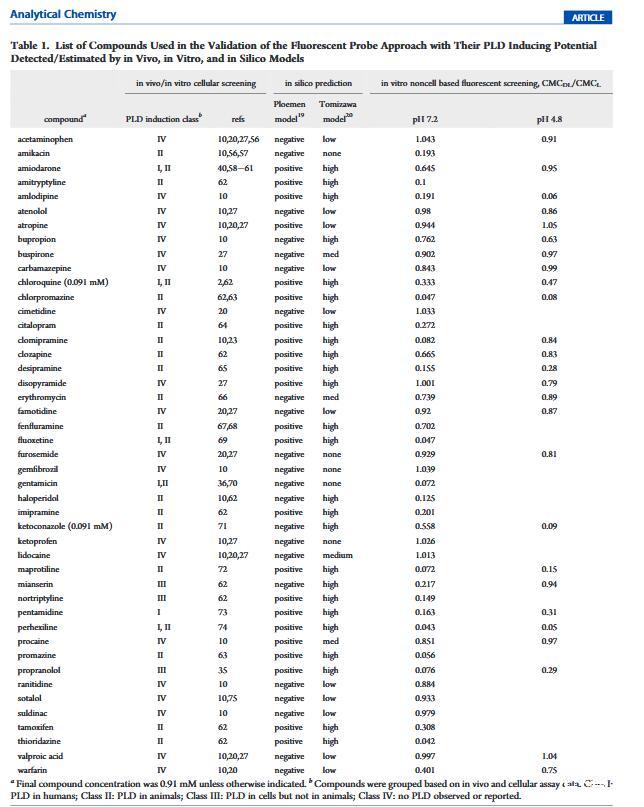 測定pH影響。PLD中的脂質紊亂主要在構成酸性的溶酶體區(qū)室中觀察到環(huán)境。為了模擬溶酶體條件,pH 4.8醋酸鹽在PLD篩選研究中使用緩沖液,25種進行研究使用上述相同的程序商業(yè)化合物(表1)對。大多數(shù)化合物在結果相似兩種緩沖液中的;然而,胺碘酮、氯米帕明、米安色林和華法林給出了截然不同的數(shù)據(jù),將前三種化合物從PLD誘導劑轉移到非誘導劑,將華法林劑轉移從非誘導到誘導劑,從pH 7.2到pH 4.8。