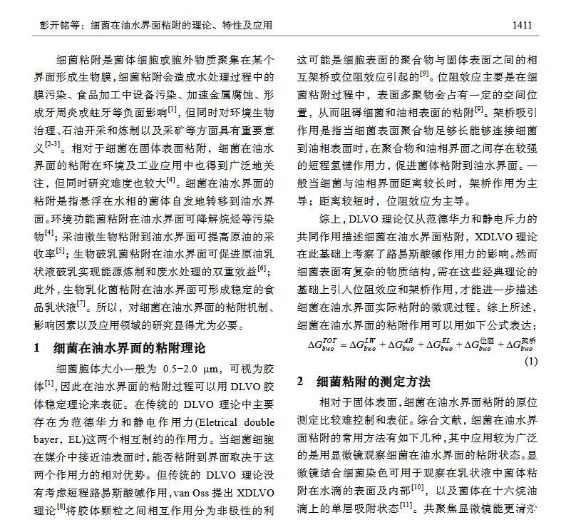 摘 要:細菌在油水界面粘附主要應(yīng)用于烷烴污染的環(huán)境修復(fù)、石油開采與加工、食品加工等方面,其研究已經(jīng)引起各界的廣泛關(guān)注。本文基于 XDLVO 理論闡述細菌在油水界面的粘附機理;總結(jié)細菌表面特性、油相及水相性質(zhì)對細菌粘附的影響;介紹細菌粘附作用在微生物驅(qū)油、生物乳化與破乳以及烷烴降解方面的應(yīng)用,并對今后的研究方向提出展望。